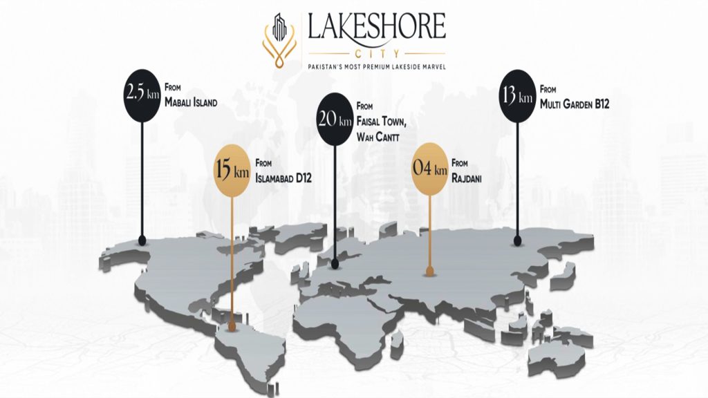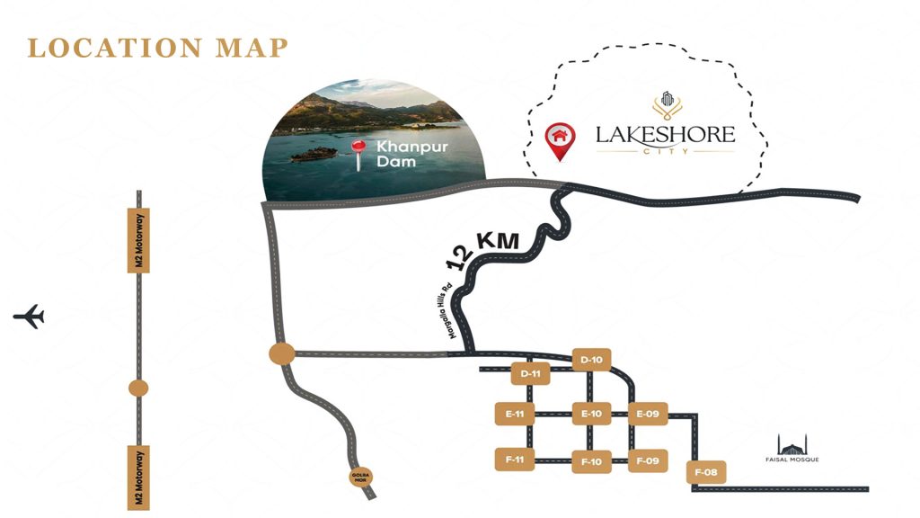 Lakeshore City is strategically located near the famous Khanpur Dam in Khanpur City, KPK. According to the Lakeshore City Khanpur location map, it is located at a short drive of 15 minutes from the D-12 sector of Capital City Islamabad. Mabali Island, an attractive and charming tourist place, is located at a distance of 2.5 km. Lakeshore City offers convenient accessibility to major well-planned residences like Faisal Town, Rajdani, and Multi Garden B-17.